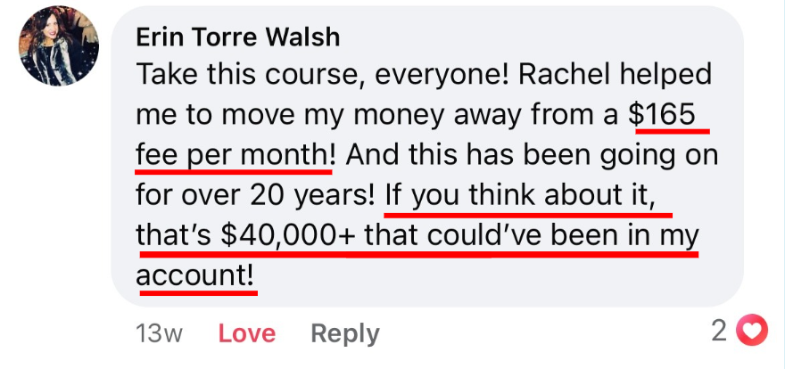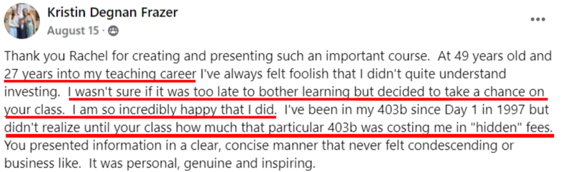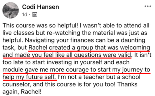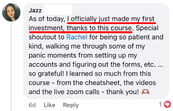 I believe in this program so much that if you don't feel more confident about investing after taking this course, I will issue a full refund. I want to make you wealthy, not sell you something you don't want! Just email Rachel at [email protected] directly for a refund.